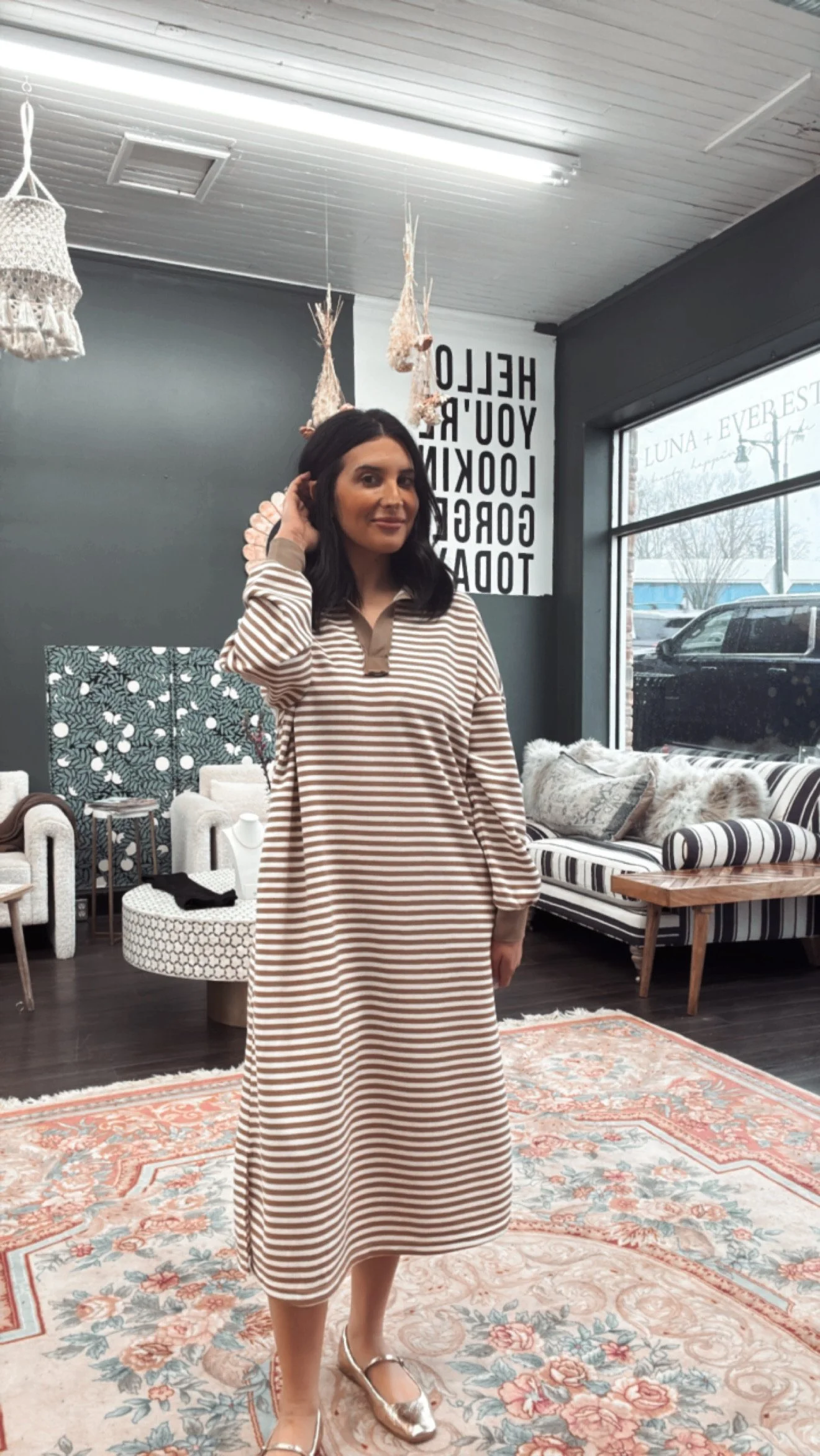 Store Every Day but not Basic tee $30.00 Sarah Jessica Parker Skirt $88.00 In my little Polka Dot, you know the rest $98.00 Sun Glasses $20.00 The "Heather" Short $46.00 We love Dupe -Grey Jumpsuit- So Comfy $98.00 Brown Striped Dress Maxi $88.00 Green Bow Sweater $74.00 Blue Jogger Pants $70.00 The Comfiest Winter Cream Sweats $69.00 The Perfect Brown(Mocha) Dress - The collar detail is everything $72.00 The Perfect Fall Subtle Dress $68.00 Black Tunic $60.00 The Slouchy -Comfort Jeans $105.00 Cheetah +Size Sweater $85.00 Chambrey Blue Champagne $78.00 Dazzaling Button Up $78.00 The Very Demure Floral vest $92.00
